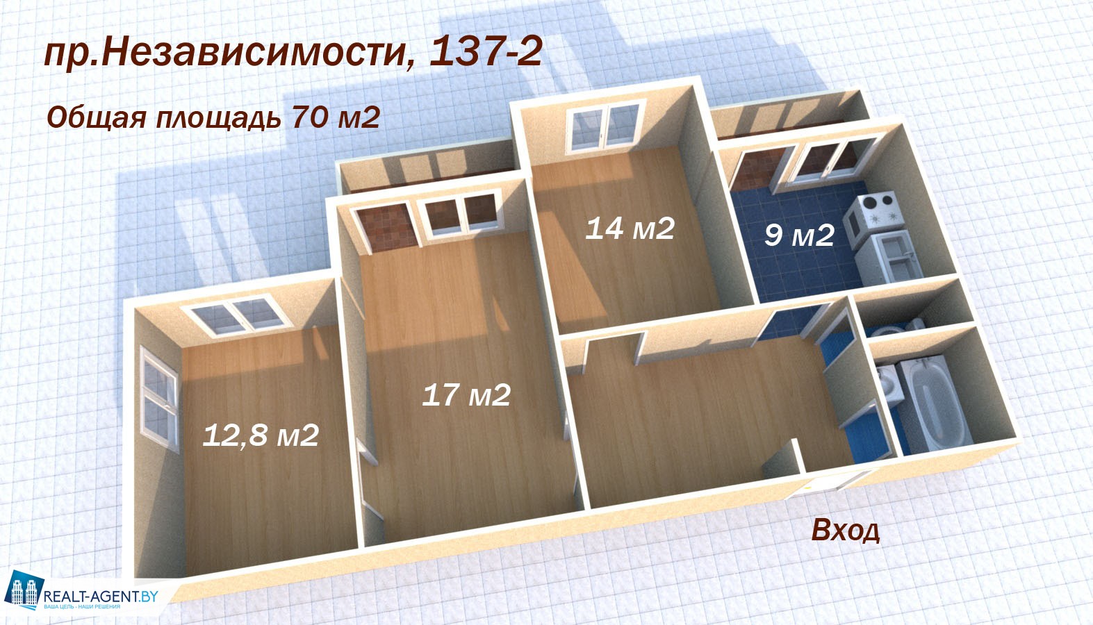 | Площадь общая/жилая/кухня | 70/ 43,2/ 9 |