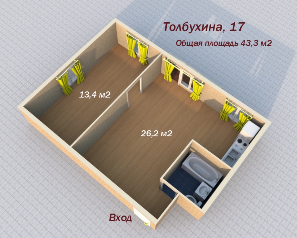 | Площадь общая/жилая/кухня | 43,3/ 33/ 26,2 |